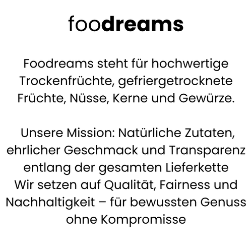 Foodreams steht für hochwertige Trockenfrüchte, gefriergetrocknete Früchte, Nüsse,