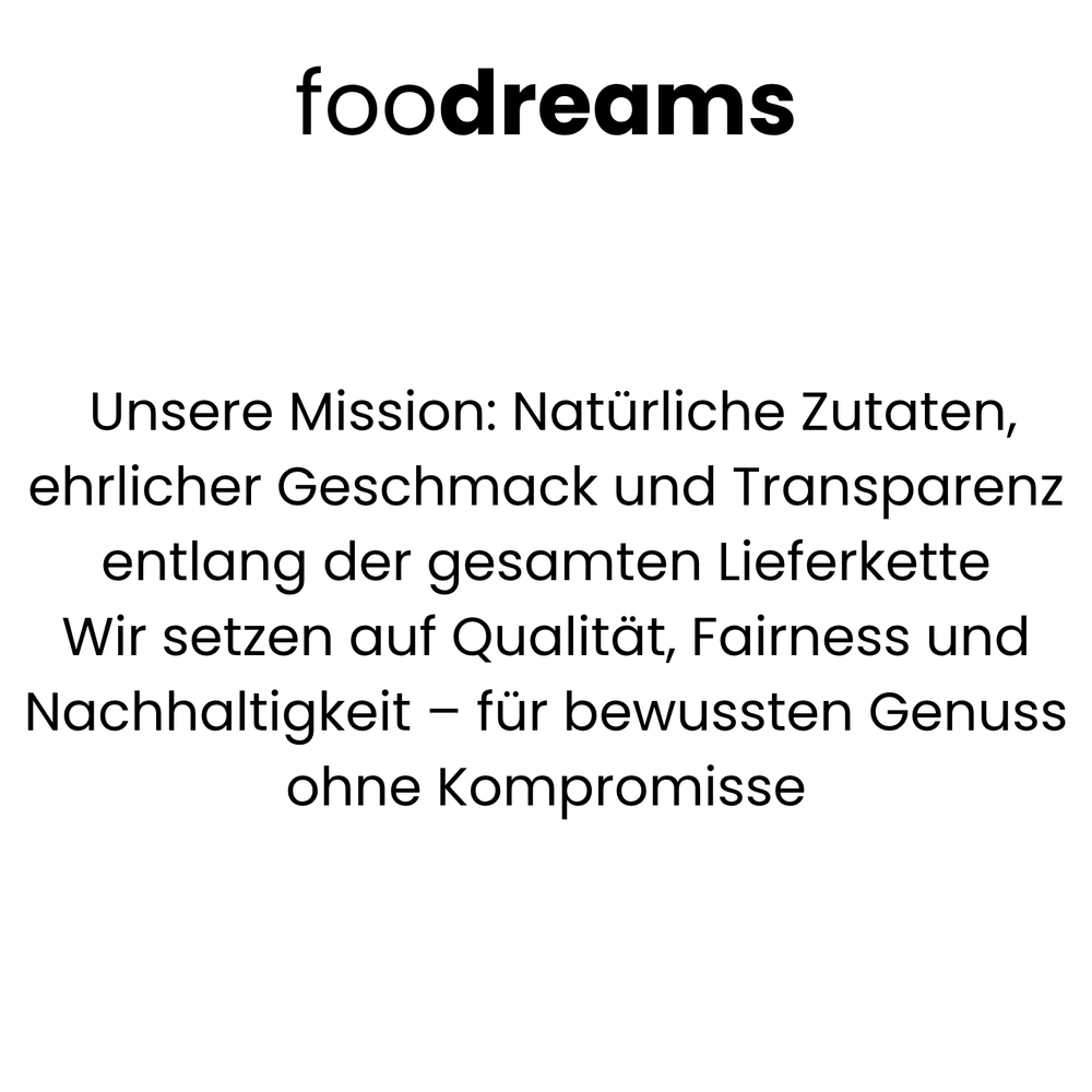 Foodreams steht für ausgewählte Tees, Trockenfrüchte, Nüsse & Gewürze in ehrlicher Qualität. Wir achten auf schonende Verarbeitung, transparente Herkunft und vollmundigen Geschmack – für bewussten Genuss ohne Kompromisse.